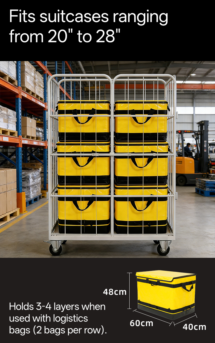 إن WL-RC-004 عبارة عن قفص أسطواني قابل للطي صغير الحجم يبلغ ارتفاعه 1700 مم، وهو مُحسَّن لأمتعة المطارات وفرز متاجر التجزئة، ويوفر تخزينًا عالي الكثافة وتخصيصًا بين الشركات من DeliverKingdom.